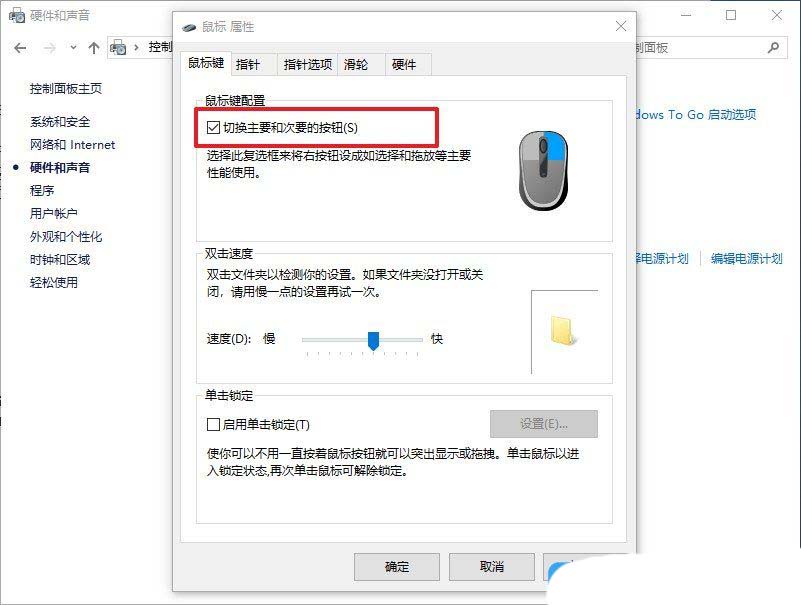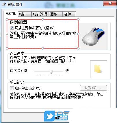 4、鼠标 属性窗口中,默认不勾选切换主要和次要的按钮,但是如果大家需要调换鼠标的左键和右键,勾选后,直接点击确定即可;