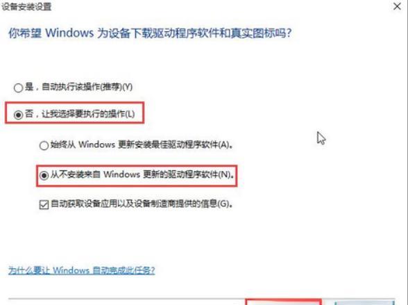 - 在弹出的窗口中,选择“否,让我选择要执行的操作”,并勾选“从不安装来自windows update的驱动程序软件”。
