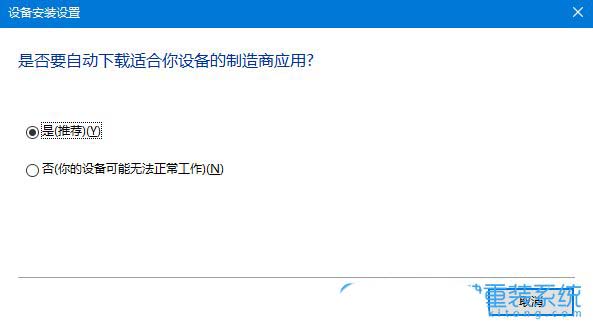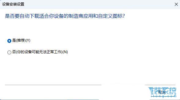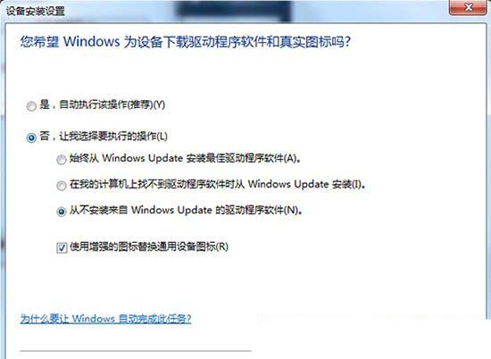 4、设备安装设置,您希望 windows 为设备下载驱动程序软件和真实图标吗?将是,自动执行该操作改为否,让我选择要的操作,然后选择从不安装来自 windows updata 的驱动程序软件,最后再点击确定即可;