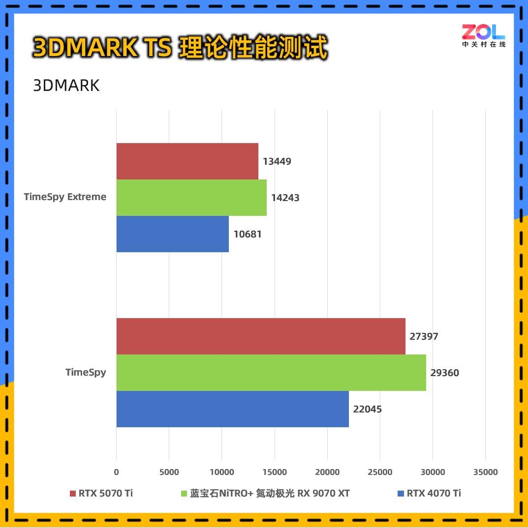 我们首先通过3dmark系列测试评估显卡的理论性能,测试涵盖dx11环境的fire strike套装和dx12环境的time spy套装,同时与同级别的rtx 5070 ti进行对比。
