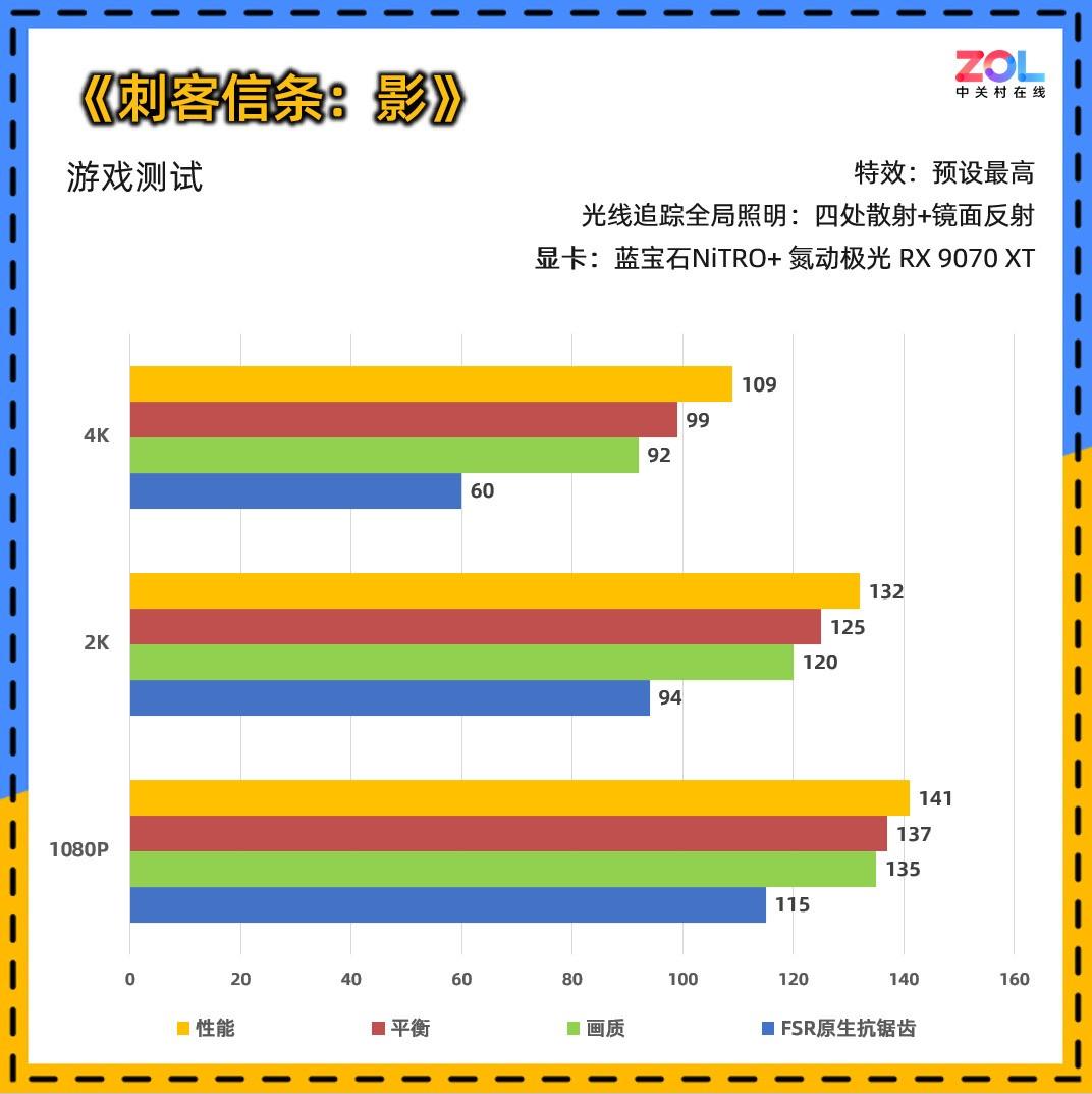 在《刺客信条:影》中,测试开启最高特效,并开启光线追踪全局照明,虽然游戏仍然存在低分辨率帧数低的问题,但是可以看出蓝宝石nitro+ 氮动极光 rx 9070 xt在高分辨率下帧数的优秀表现。