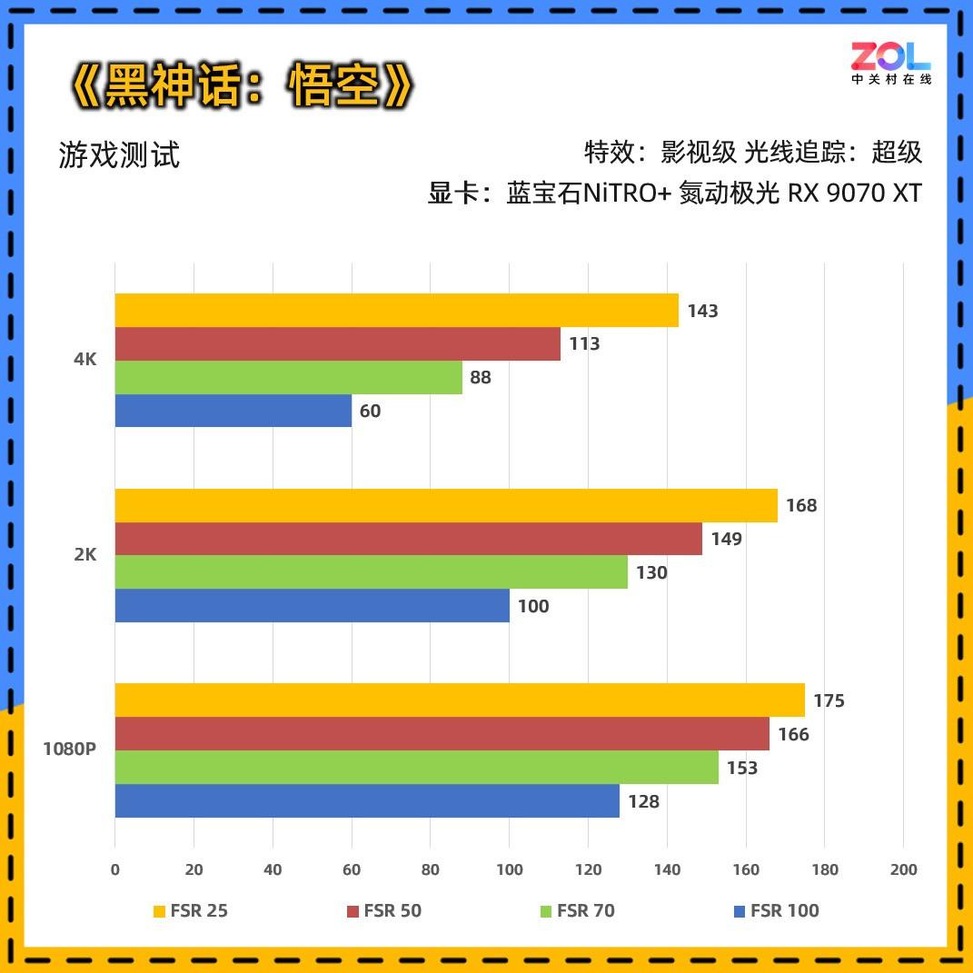 《黑神话:悟空》自带的benchmark集成了fsr功能,从测试结果来看,蓝宝石nitro+ 氮动极光 rx 9070 xt同样有很好的性能发挥,4k分辨率下的帧数可以达到143之多。