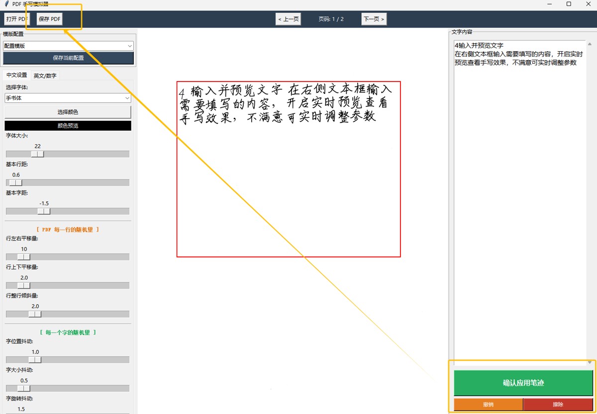 确认并保存:效果满意后确认应用笔迹,支持撤销、擦除错误内容,也可保存当前配置为模版,最后导出填写完成的 pdf。