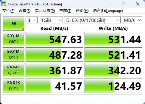 crystaldiskmark测试了ssd在理想情况下的最大顺序读写速度,以及理论最大4k随机读写性能。实测长江存储se006 1.92tb顺序读写547.63/531.44 mb/s,4k单线程随机读取41.57mb/s,在sata iii ssd中都属于“满速”水平了。