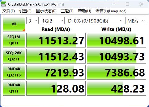 crystaldiskmark测试了ssd在理想情况下的最大顺序读写速度,以及理论最大4k随机读写性能。实测sm2504xt搭配闪迪bics8 tlc闪存,顺序读写速度在11.5/10.5 gb/s的水平,4k随机读写约合1805k/1847k iops,4k单线程随机读取达到128.08 mb/s。