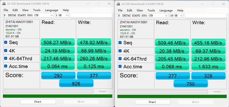 as ssd benchmark已经很多年没更新过了,但用来测试sata ssd还可以,在1gb的测试中,致态小翼s001 1tb ssd得分为826分。顺序读写速度分别为508mb/s、478mb/s,4k读写速度则是24mb/s、68mb/s,基本达到sata硬盘的极限水平。