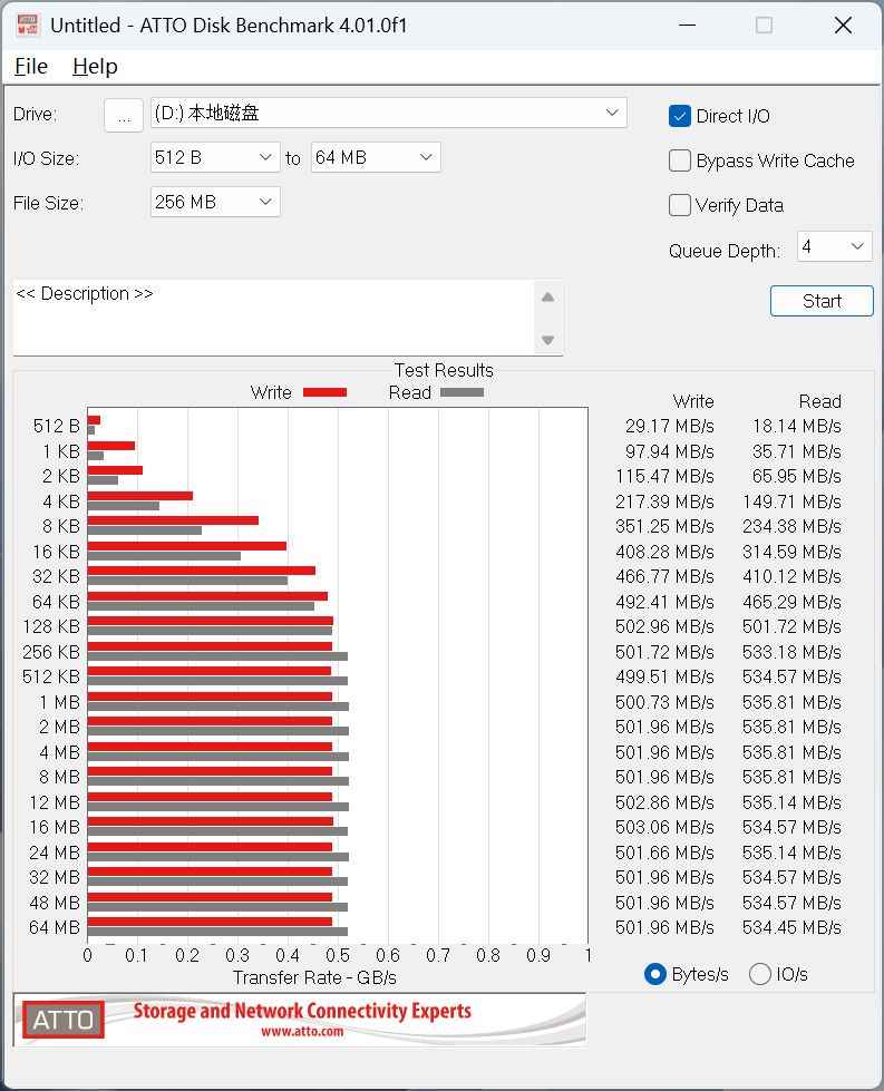 atto disk benchmarks结果来看,对于0.5kb的小文件读写,致态小翼s001 1tb ssd能达到29mb/s的写入速度和18mb/s的读取速度,32k的时候,读写速度都超过了400mb/s,从256kb开始,写入速度稳定在500mb/s左右,读取速度则能达到530mb/s以上。