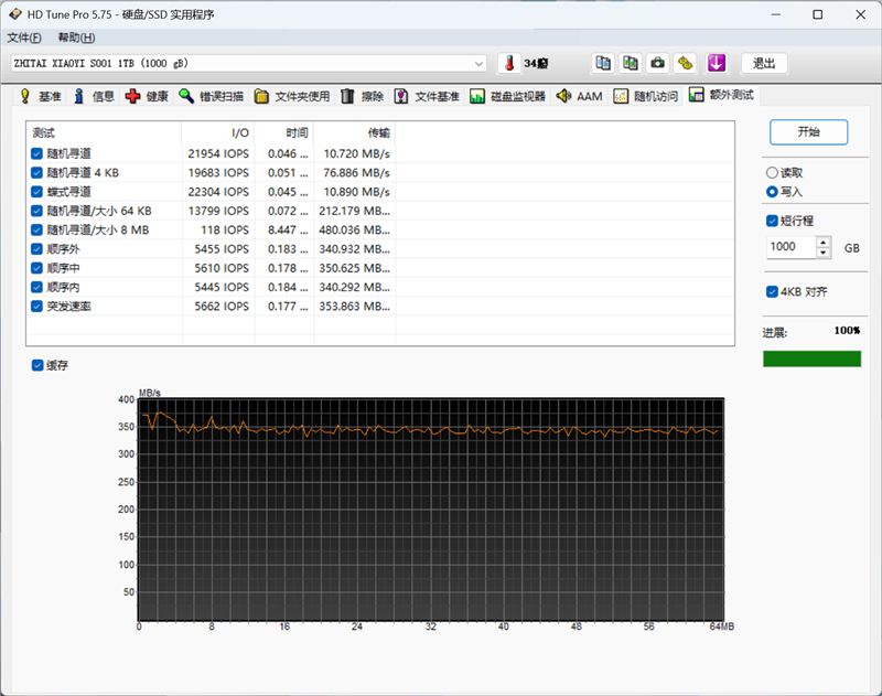 aida64磁盘测试中的线性写入测试,是在不依赖文件系统时,向ssd中写入数据,一直到写满为止,可以测试ssd在缓存耗尽之后的真实性能。