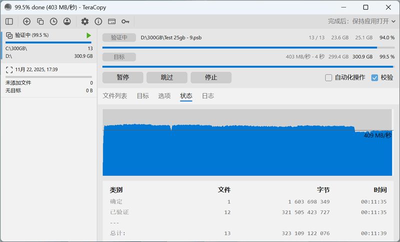 可以看到致态小翼s001 1tb ssd在300gb文件写入过程中保持较为平稳的速度,没有剧烈的波动,校验是读取速度也十分平稳,只在最后结尾时略有下降。