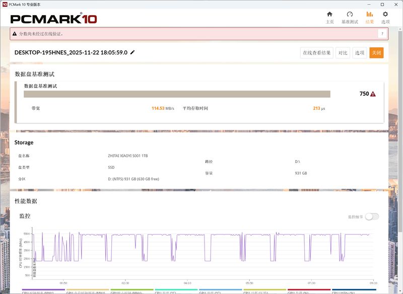 考虑到今天用户应该也不会把系统安装在sata ssd中,我们也进行了数据盘基准测试,致态小翼s001 1tb ssd的得分为750分,测试带宽为114mb/s,平均存取时间为213毫秒。