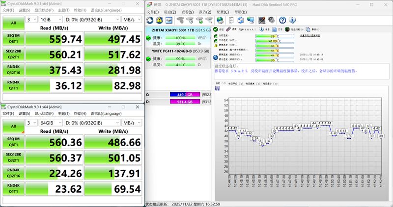 在室温约24度时,待机状态下致态小翼s001 1tb ssd温度在32度左右,在高强度进行连续读写操作后,最高温度也只有44度。