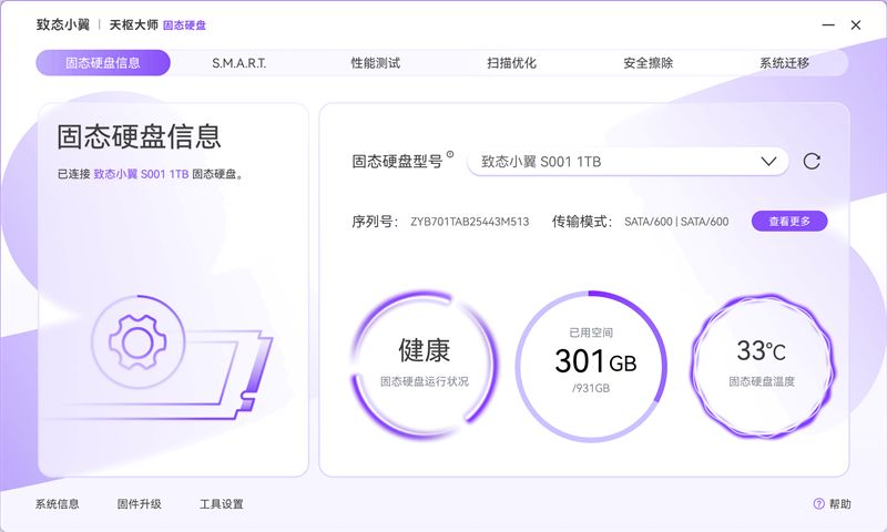 ssd配套的天枢大师软件也同步更新到了4.0版本,界面小幅改版,提供了一些非常实用的功能。