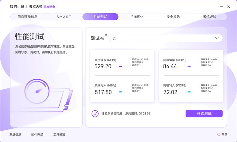 致态天枢大师软件中还集成了十分直观的性能测试功能,可以对ssd的性能进行测试,如果发现ssd的性能下降,后面还提供了优化功能来恢复ssd的性能。