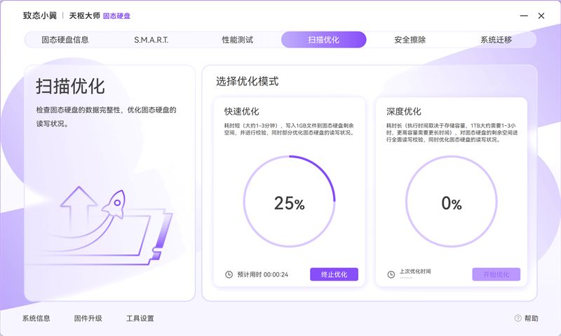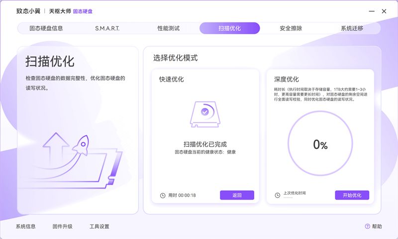 致态天枢大师软件中提供了快速优化和深度优化两种优化方案,用户可以根据自己的具体使用情况选择,由于时间关系我们就用快速优化功能对致态小翼s001 ssd进行了一轮优化,再加上目前致态小翼s001 ssd还是基本全新的空盘,快速优化仅用时18秒。