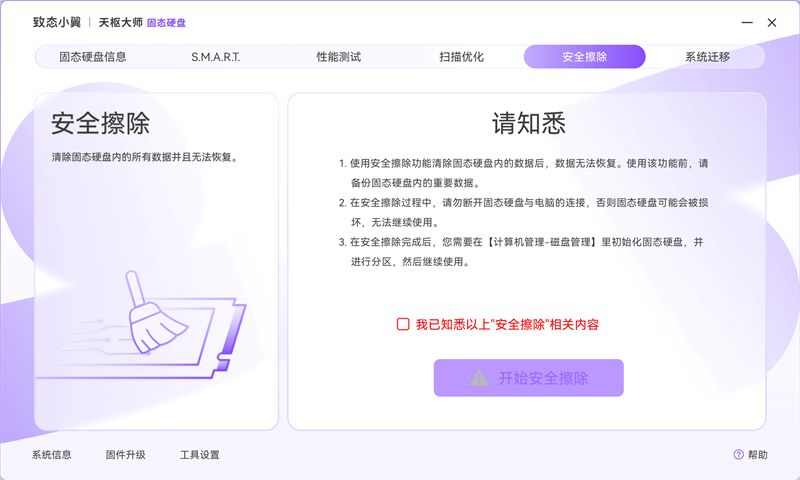 安全擦除功能可以彻底的抹除ssd中全部的数据,类似机械硬盘的全盘写零或低级格式化操作,对于有数据保密需求的用户,这个功能可以安全可靠的销毁数据。