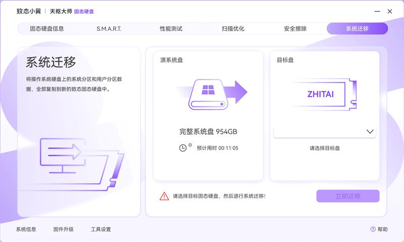 新版致态天枢大师软件中还有系统迁移功能,方便玩家将原有系统完整迁移至新ssd中,特别适合还在使用机械硬盘的老电脑将系统直接迁移至ssd中,之后就可以无缝切换,无需重装系统重新安装驱动,非常易用。
