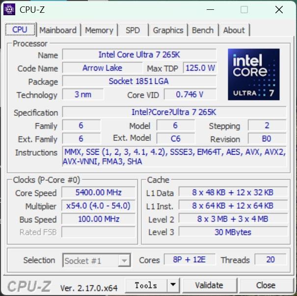 我们用酷睿ultra 7 265k来测试b860m冰雕主板,作为英特尔当代的次级旗舰处理器,用来测试中端定位的b860m冰雕主板应该是足够了。简单说下ultra 7 265k的规格,其采用8p+12e的核心配置,总计20核20线程,二级缓存36mb,三级缓存30mb,性能核基础频率3.9ghz、最大睿频5.5ghz,能效核基础频率2.3ghz、最大睿频4.6ghz,基础功耗125w,最大功耗250w。