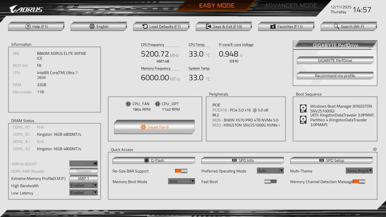 b860m冰雕主板的界面和其他冰雕主板一样,银灰色的底色,简易模式包含了日常所需的所有功能,例如内存xmp、d5黑科技、启动项、技嘉perfdrive模式等等,除非需要手动超频,不然简易模式就够用了。