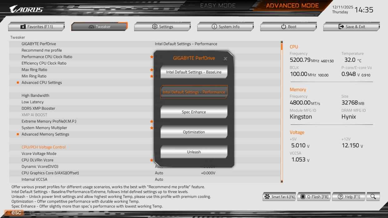按f2进入高级界面,首先第一项就是perfdrive,以前我们也介绍过这个功能,它有6个性能档位,包括英特尔的baseline(默认)、performance(性能)模式,还有技嘉优化的spec enhance、optimization和unleash模式,spec enhance可以简单理解为兼顾性能和温度的性能调优,optimization则是更注重性能的调优,unleash就是解锁功耗。如果你对性能没有比较激进的要求,那英特尔的performance(性能)和技嘉的spec enhance模式就够用了。