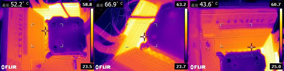 热成像仪显示最热点位于主板右上,最高温度大约在67度左右,和传感器回报的77度有一定差距。这可能是散热片比较厚实,导致表面温度和传感器回报温度有一定差距。不过,不管77度还是67度,距离温度上限都还有很远的距离,所以可以放心使用。