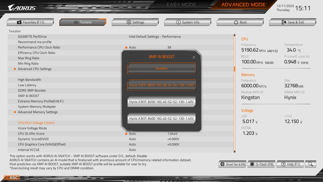 我们用的是一套金士顿的ddr5 6000mt/s cl30的内存,技嘉ai snatch评估可以超频至8200mt/s,点击应用后就会重启,然后在技嘉的bios里找到xmp ai boost,新生成的内存超频配置就在这里。虽然生成的是8200mt/s的配置,但实际是有三个配置文件,上下各一档,内存体质更好的可以选8400mt/s,内存体质差的可以选8000mt/s。