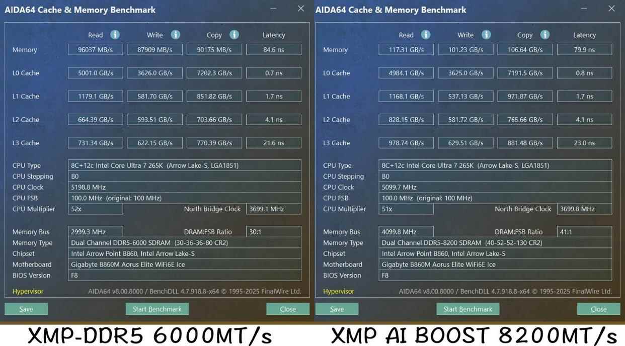 b860m冰雕主板能把6000mt/s超到8200mt/s算是个不错的成绩了,内存读写性能大概比默认的6000mt/s提高了22%和16%,内存延迟降低了5.5%,并且ai boost的时序属于比较松的那种,明显还有调整空间,有耐心想玩超频的玩家,还可以在这个配置的基础上进一步调教。
