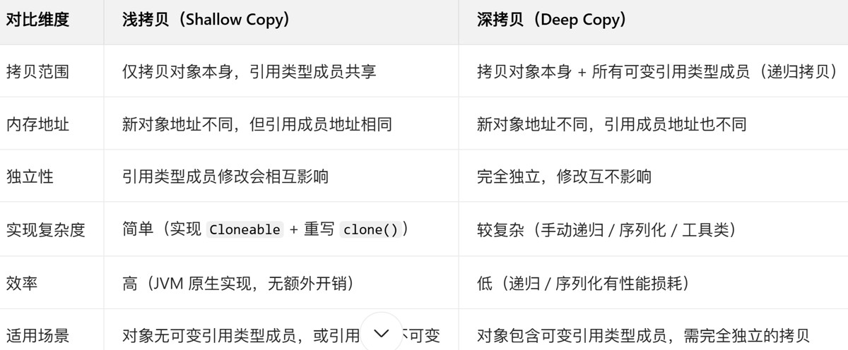 深拷贝会创建一个 完全独立的新对象:不仅拷贝对象本身,还会递归拷贝对象中所有 可变的引用类型成员变量,最终新对象和原对象的引用类型成员指向不同的内存地址,互不影响。