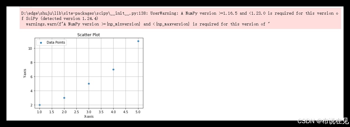 plt.xlabel('x-axis'),plt.ylabel('y-axis'),plt.title('scatter plot') - 添加图例和网格: