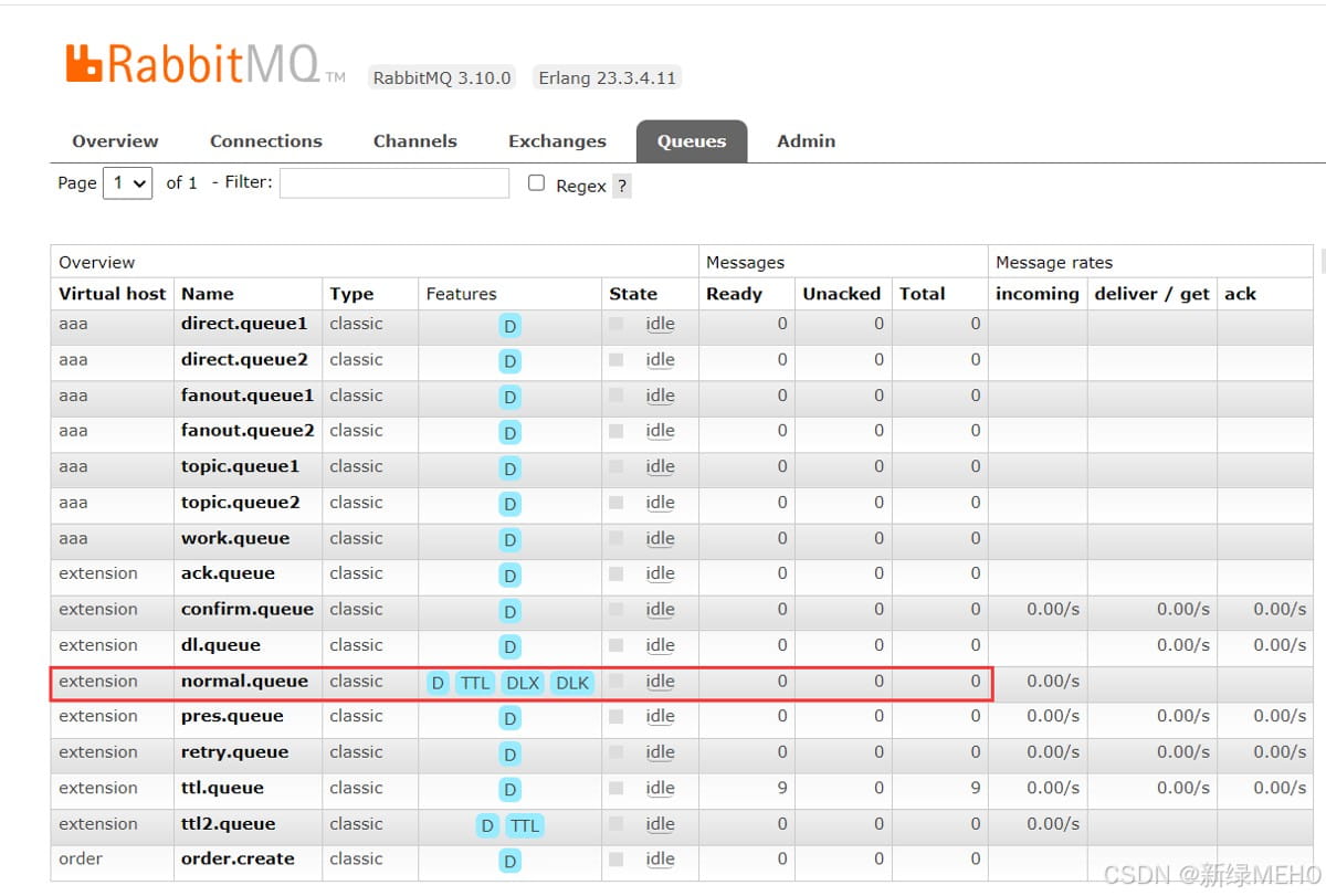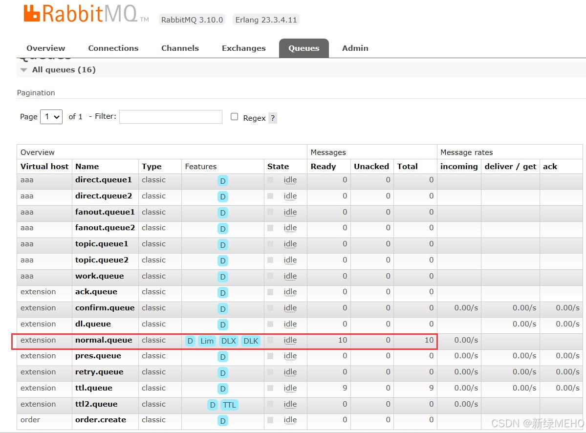 我们可以看到,消息在10秒后过期,从normal队列进入到了死信队列,消息进入到死信队列后被消费。