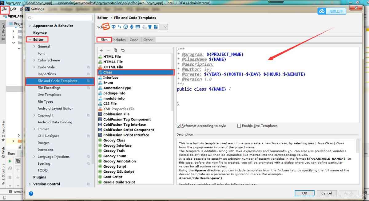 在右边的文件框里编辑需要注释的模板,应用保存之后,当我们创建类的时候就会自动生成注释。