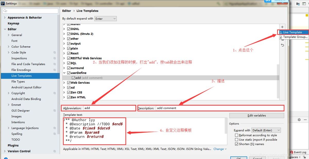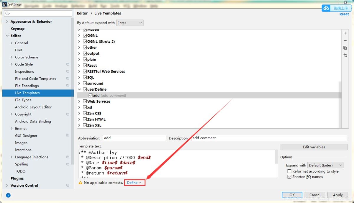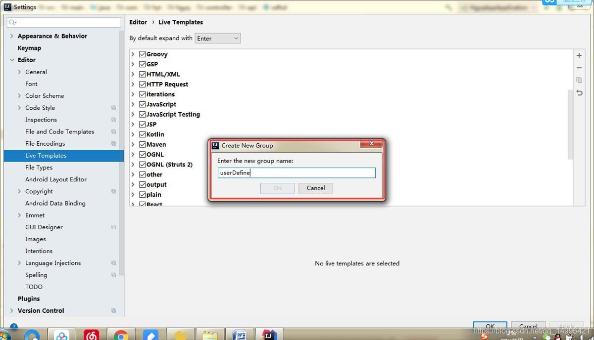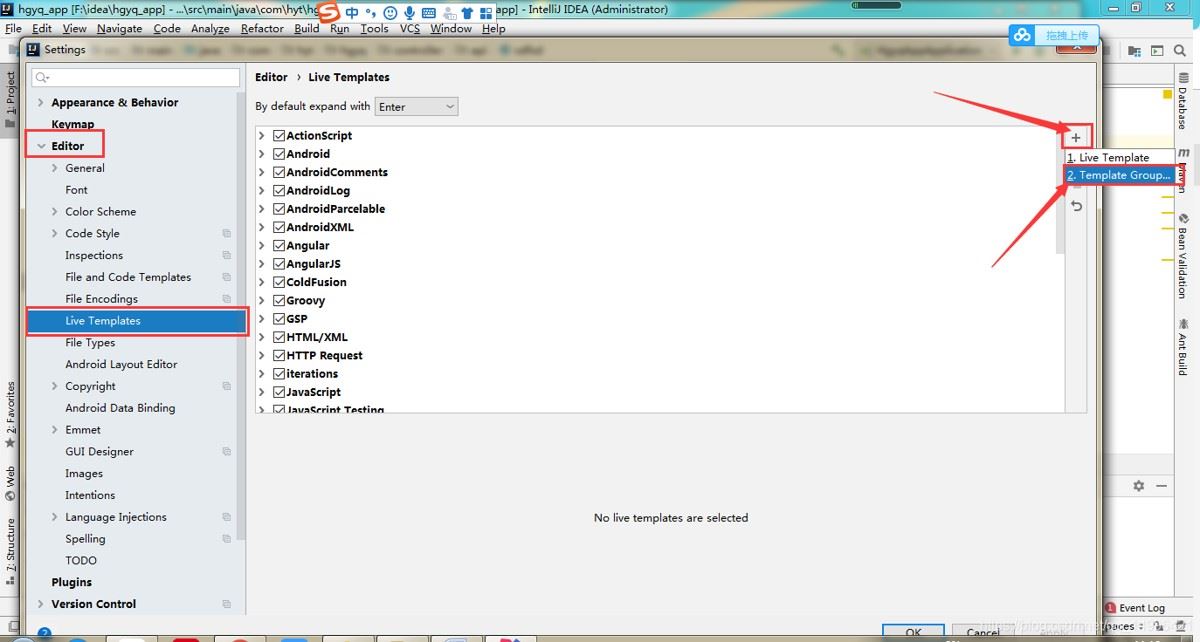 操作: file -> settings - > editor -> live templates -> 点击"+"号 -> 选择 template group