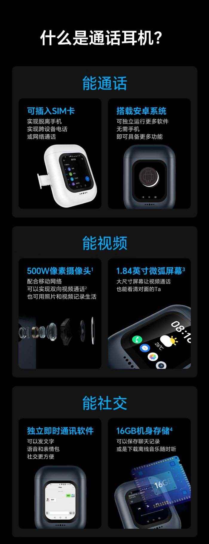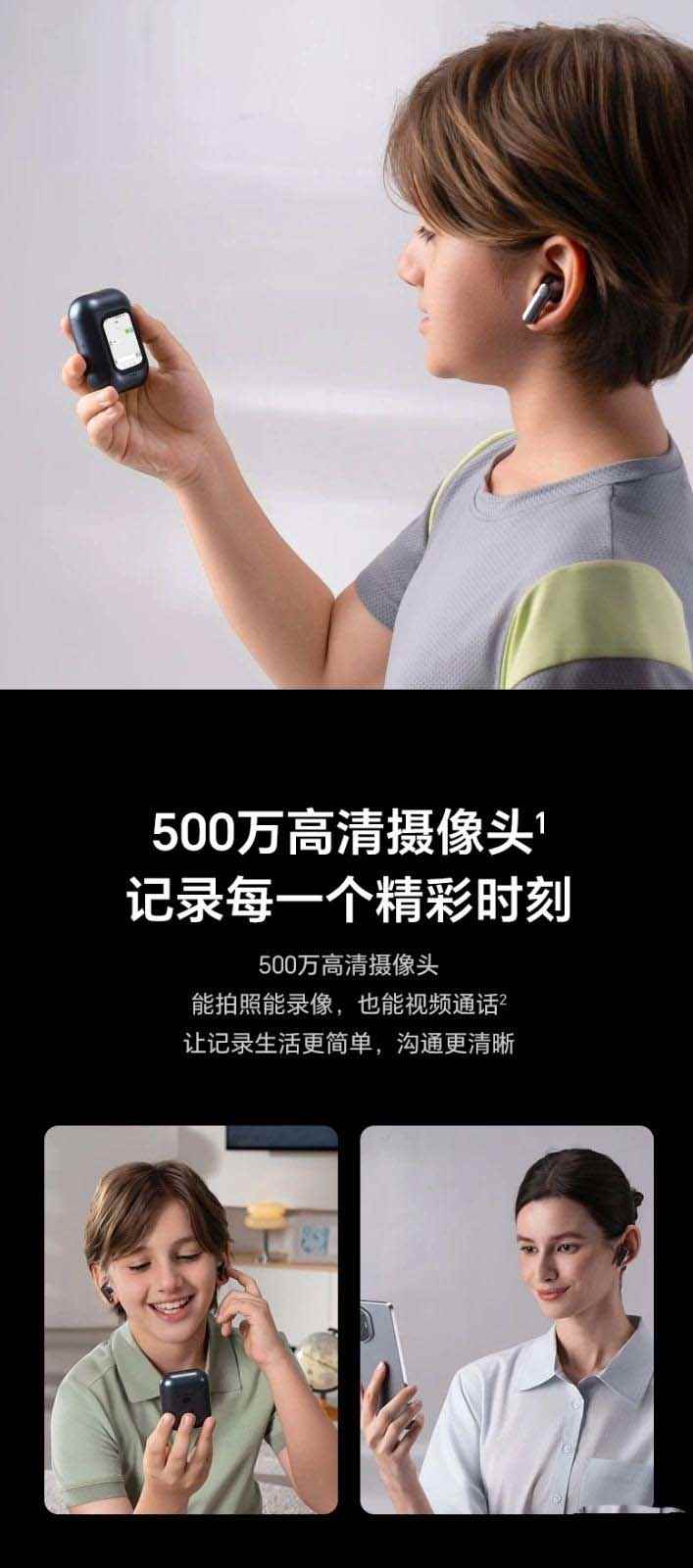 功能方面,这款耳机搭载安卓系统,可独立运行各种 app,内置 500 万像素摄像头,配合移动网络可实现双向视频通话,也可以拍照、录视频等,搭载 1.84 英寸微弧屏幕,支持独立运行“即时通讯软件”,配备 16gb 存储空间,可以下载音乐、存储聊天记录等。