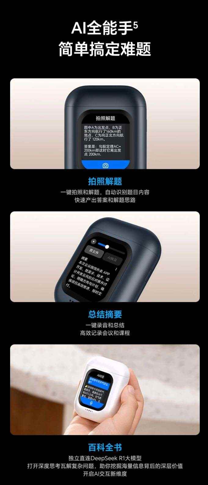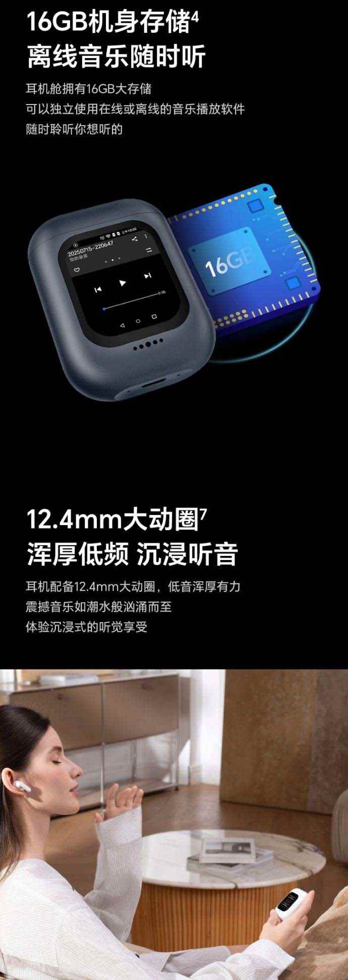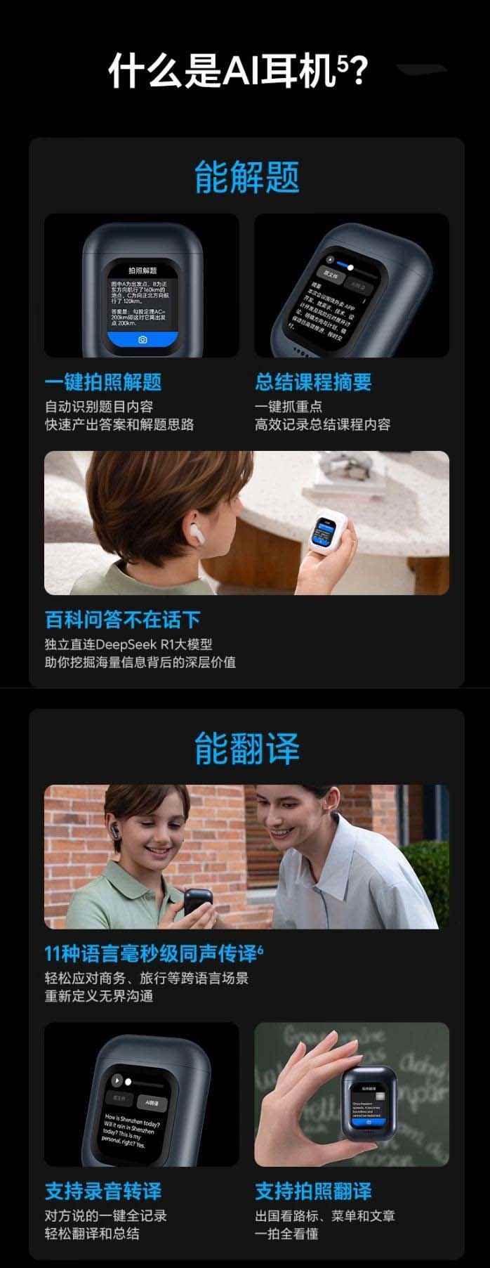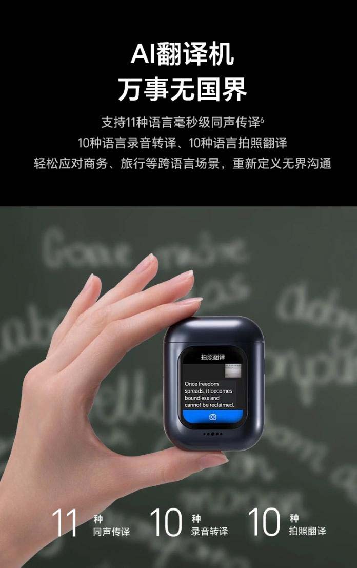 此外,这款耳机配备各种 ai 功能,支持拍照解题、总结摘要、百科全书等,还可独立直连 deepseek r1 大模型,帮助用户开启 ai 交互新维度,支持同声传译 11 种语言,还可拍照翻译,应对商务、跨国旅行等场景,拥有 12.4mm 大动圈单元,号称“低音浑厚有力”。