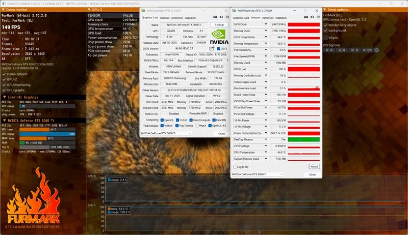 我们使用furmark对映众rtx 5060 ti 16gb超级冰龙显卡进行10分钟的烤机,室温约21度,gpu功耗稳定在190w,核心频率2497mhz,温度64.1度,风扇转速约1800rpm。