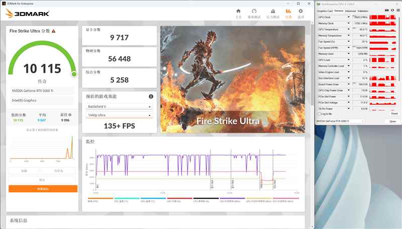 我们在3dmark测试时,也记录了gpu的工作频率,在更接近真实游戏场景中,映众rtx 5060 ti 16gb超级冰龙显卡的核心频率最高加速超过2.9ghz,最高功率释放甚至没有完全吃满190w,温度和风扇都略低于烤机时的状态。