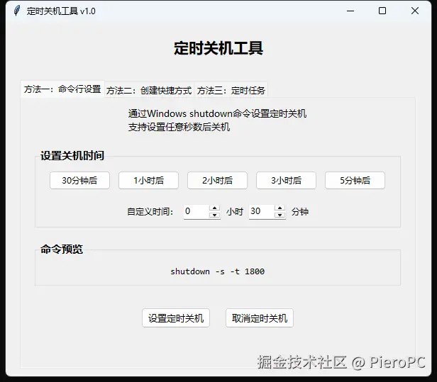下面是一个使用 python tkinter 实现前三种定时关机方法的完整程序: