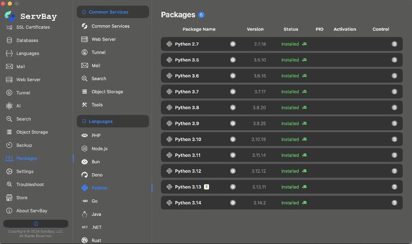 推荐使用 servbay 来管理开发环境,它支持一键安装 python 环境,覆盖了从半只脚踏进棺材板的 python 2.7 到python 3.5 乃至最新的 python 3.14 版本。而且这些版本可以同时并存,不需要手动去配置环境变量,也不用担心弄乱系统的默认配置。装好就能用,一分钟就能搞定。