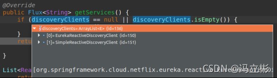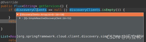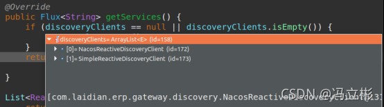 再次启动调试就可以看到数组变量discoveryclients中有nacosreactivediscoveryclient了: