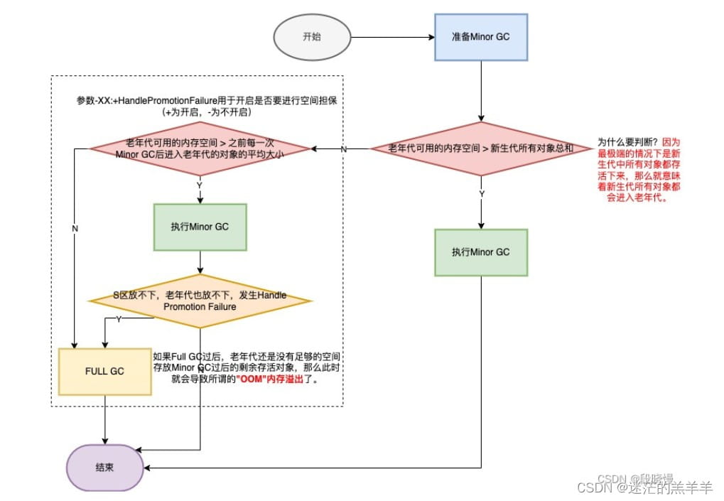 - 如果存活对象大于survivor区,还大于老年代,则尝试进行一次fullgc,fullgc后再次判断,如果放不下存活对象则会oom