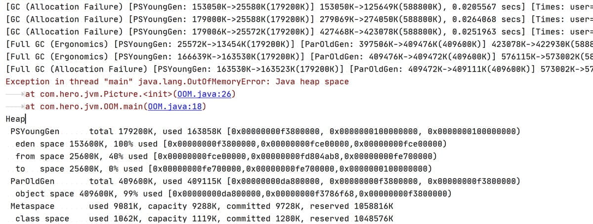 - 老年代也满了之后,发生了三次minorgc,未释放出可用空间后,进行了三次fullgc最后抛出了oom