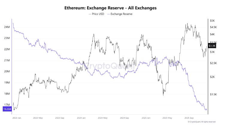 以太坊正悄然向稀缺性驱动的市场转型。目前仅有 8.7% 的 eth(约 1660 万枚)仍停留在中心化交易所,这表明大多数持有者正持续将资产从交易平台转移出去。尽管许多以太坊价格预测仍然强调看跌压力,但供应趋势却呈现出截然不同的景象。