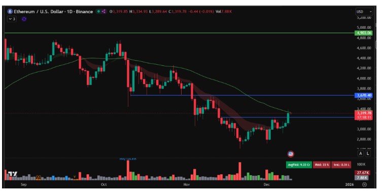 全球第二大加密货币以太坊顶住了熊市压力,在盘整数周后突破了 3100 美元的阻力位。目前,以太坊交易价格为 3325 美元,市值约为 4010 亿美元,较第三季度强劲反弹。