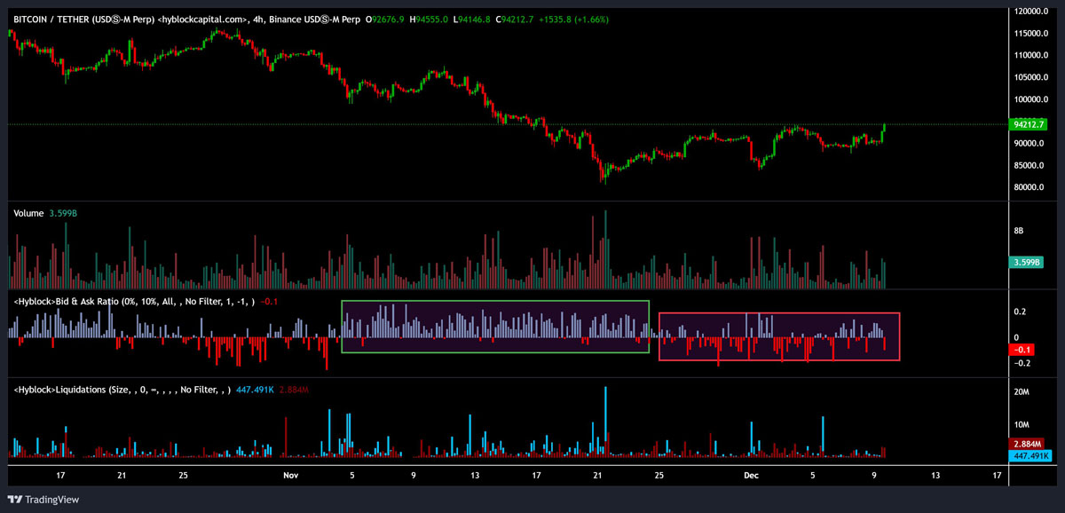 比特币买卖价差比率和清算数据分析。来源:hyblock
