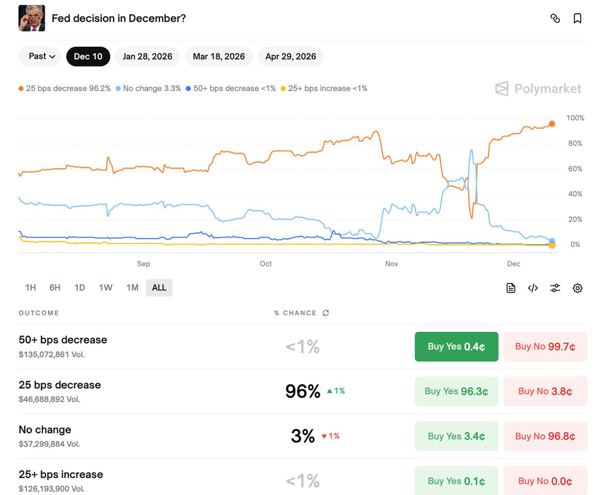 polymarket 显示利率降至3.50%至3.75%之间的概率为96.8%,而利率保持不变的概率为3%。