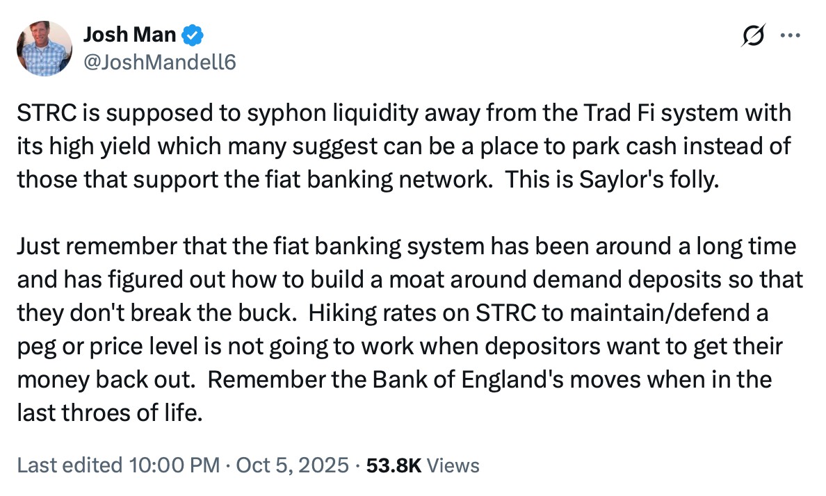 “法币银行体系已经存在很久,并且已经找到了围绕活期存款建立护城河的方法,以确保它们不会跌破面值。为了维持或捍卫某个锚定价格而提高strc的利率,在存款人想把钱取出来的时候是行不通的。”