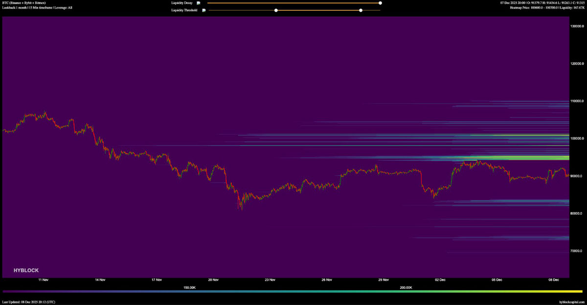 同样,btc/usdt(binance永续合约)的订单簿数据显示,从90000美元开始的卖单墙,并在94000美元至95000美元之间加厚。