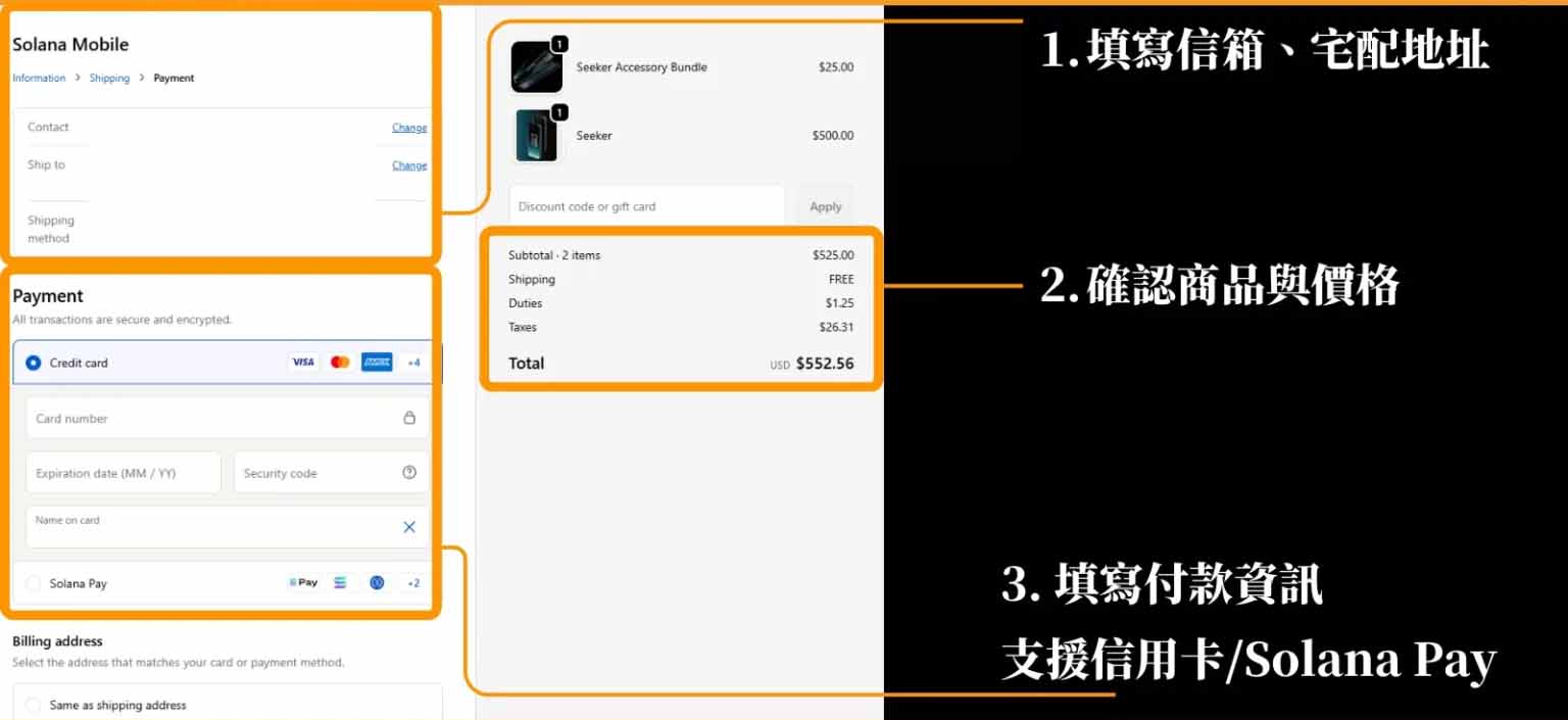 以小编的购买画面为例,可以查看图片左侧图片的订单编号、配送地址、个人联系信息,右侧字段则是solana seeker手机、保护壳、税金等等信息。