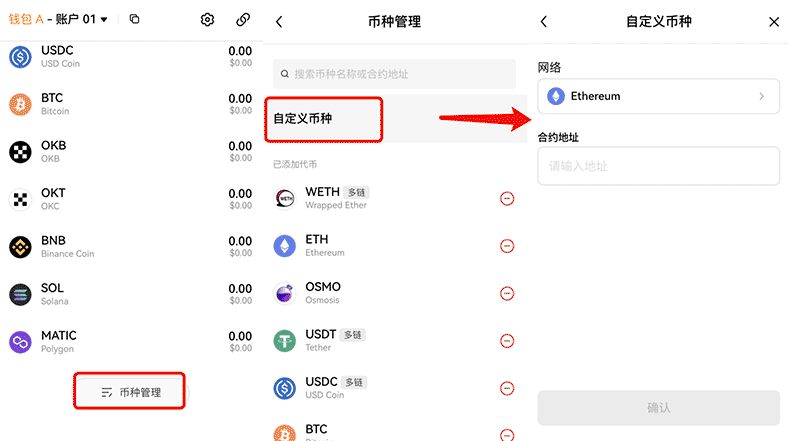 如果要收款的币种不在已添加****币种内,在钱包首页下拉至币种管理并点击 > 自定义币种,选择对应的网络,输入合约地址,点击确认完成添加。