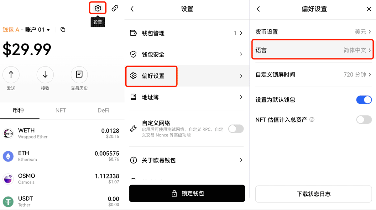 打开欧易 web3 钱包,点击设置 > 偏好设置 > 语言。