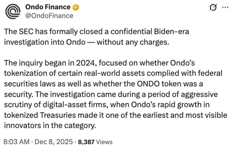 美国证券交易委员会正式终止了对纽约代币化平台ondo finance的调查,该调查始于2023年。